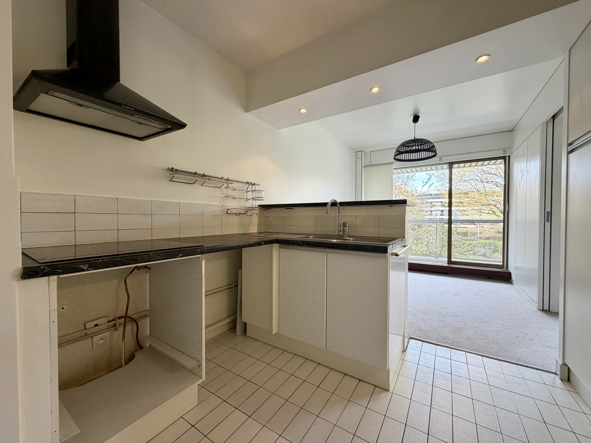 Il se compose d’une entrée avec rangements, de deux pièces principales lumineuses donnant accès à un balcon filant ainsi que d’une cuisine séparée semi-équipée (plaque et hotte) offrant également un accès au balcon.
